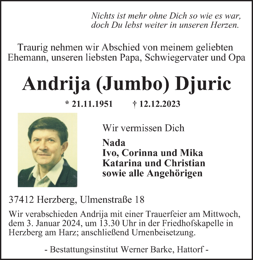 Hier finden Sie alle Traueranzeigen aus der Zeitung, die bisher für Andrija Djuric erschienen sind. Weitere Traueranzeigen, die in der Zeitung erscheinen, werden hier ebenfalls aufgelistet