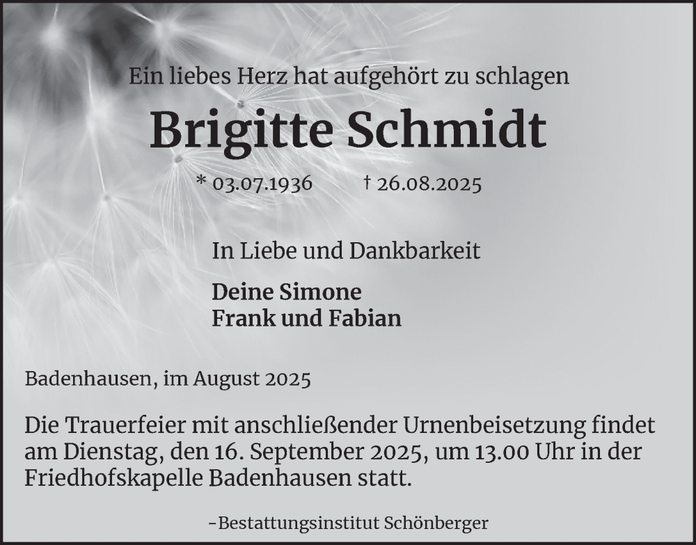 Hier finden Sie alle Traueranzeigen aus der Zeitung, die bisher für Brigitte Schmidt erschienen sind. Weitere Traueranzeigen, die in der Zeitung erscheinen, werden hier ebenfalls aufgelistet