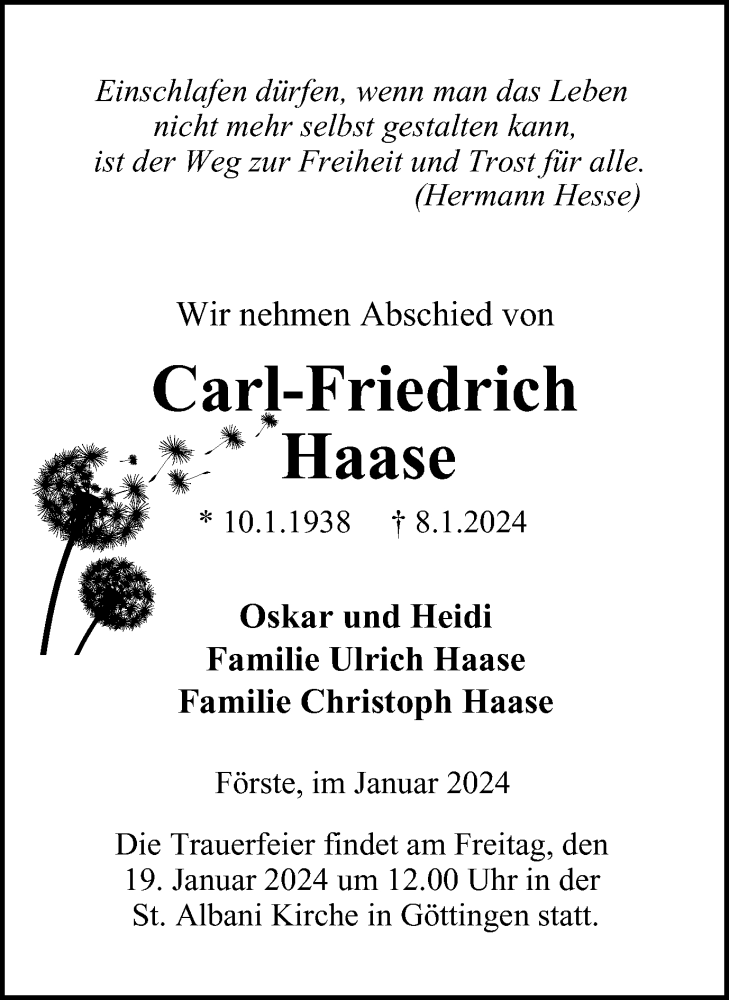 Hier finden Sie alle Traueranzeigen aus der Zeitung, die bisher für Carl-Friedrich Haase erschienen sind. Weitere Traueranzeigen, die in der Zeitung erscheinen, werden hier ebenfalls aufgelistet