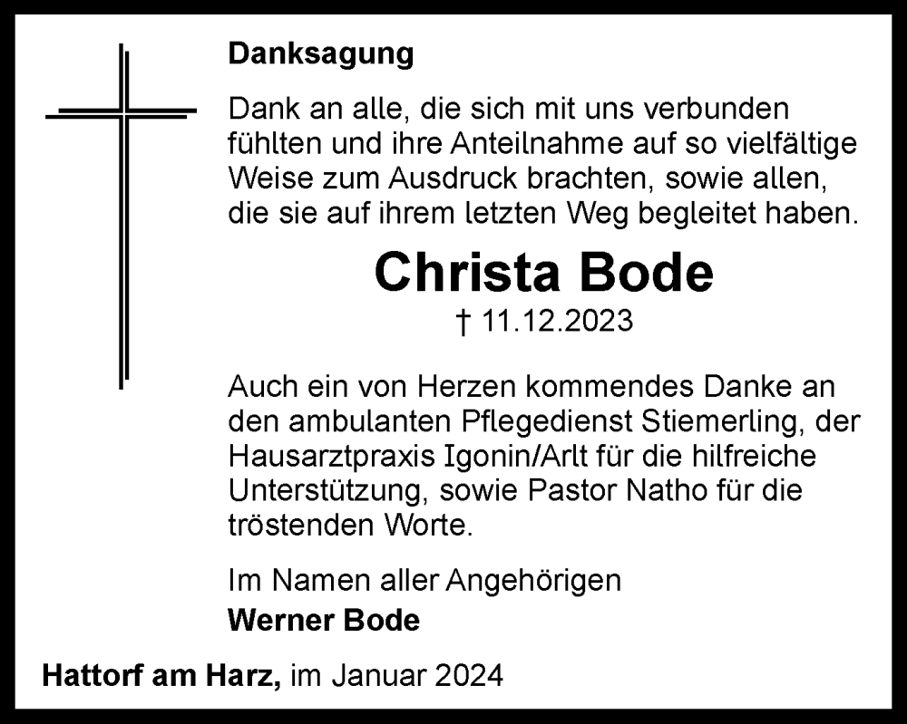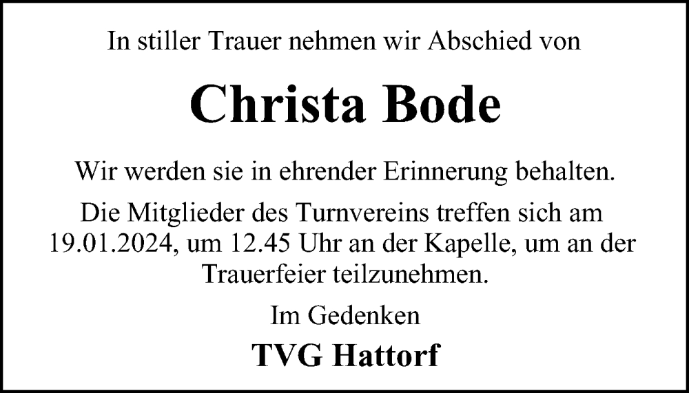 Hier finden Sie alle Traueranzeigen aus der Zeitung, die bisher für Christa Bode erschienen sind. Weitere Traueranzeigen, die in der Zeitung erscheinen, werden hier ebenfalls aufgelistet