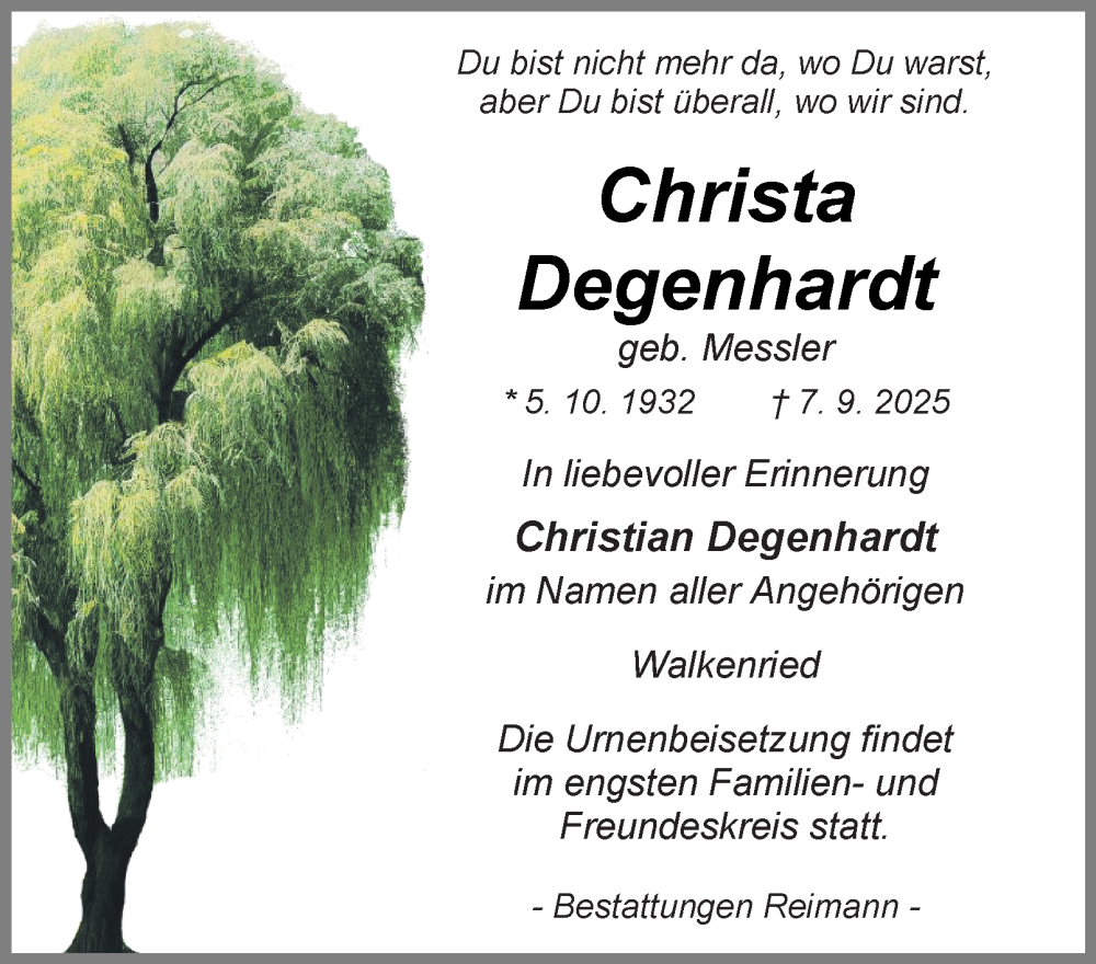 Hier finden Sie alle Traueranzeigen aus der Zeitung, die bisher für Christa Degenhardt erschienen sind. Weitere Traueranzeigen, die in der Zeitung erscheinen, werden hier ebenfalls aufgelistet