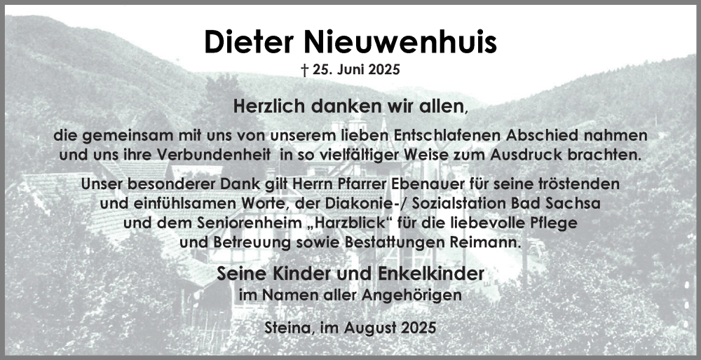 Hier finden Sie alle Traueranzeigen aus der Zeitung, die bisher für Dieter Nieuwenhuis erschienen sind. Weitere Traueranzeigen, die in der Zeitung erscheinen, werden hier ebenfalls aufgelistet