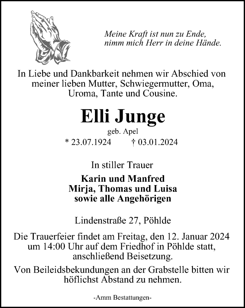 Hier finden Sie alle Traueranzeigen aus der Zeitung, die bisher für Elli Junge erschienen sind. Weitere Traueranzeigen, die in der Zeitung erscheinen, werden hier ebenfalls aufgelistet