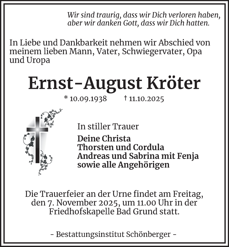 Hier finden Sie alle Traueranzeigen aus der Zeitung, die bisher für Ernst-August Kröter erschienen sind. Weitere Traueranzeigen, die in der Zeitung erscheinen, werden hier ebenfalls aufgelistet