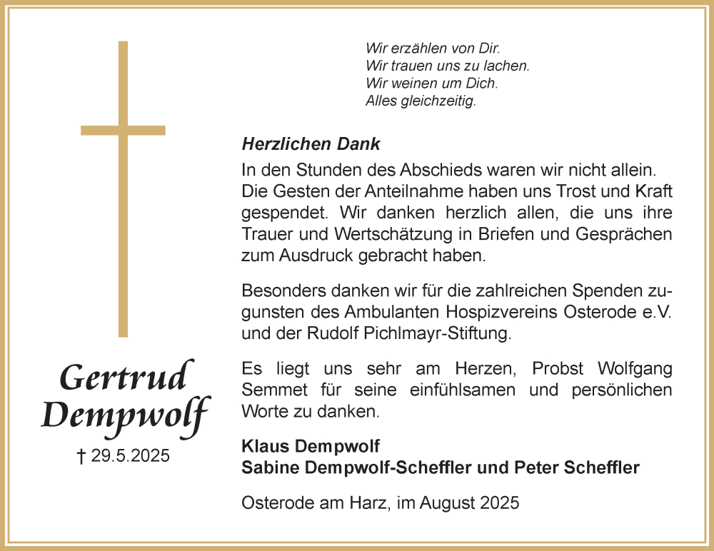 Hier finden Sie alle Traueranzeigen aus der Zeitung, die bisher für Gertrud Dempwolf erschienen sind. Weitere Traueranzeigen, die in der Zeitung erscheinen, werden hier ebenfalls aufgelistet
