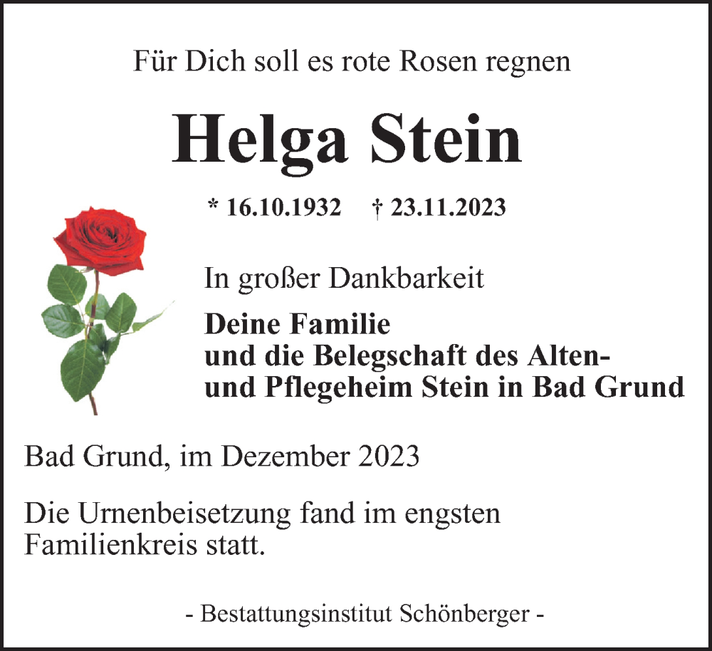 Hier finden Sie alle Traueranzeigen aus der Zeitung, die bisher für Helga Stein erschienen sind. Weitere Traueranzeigen, die in der Zeitung erscheinen, werden hier ebenfalls aufgelistet