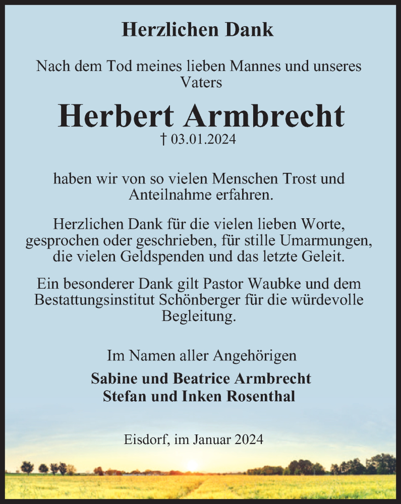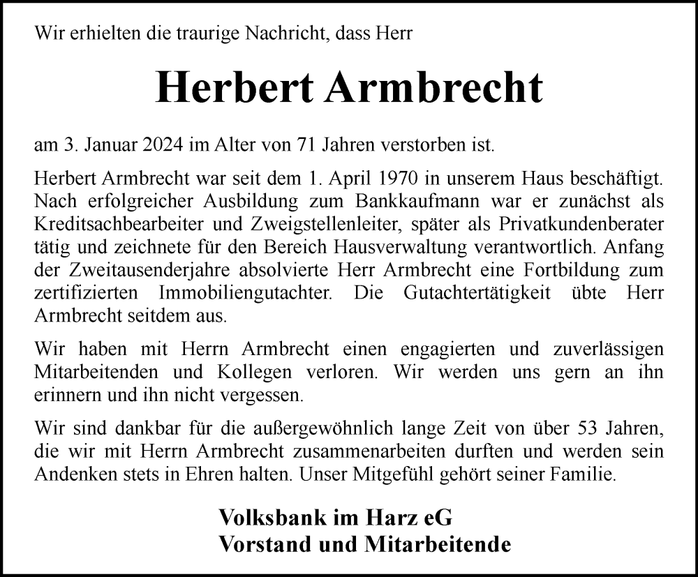 Hier finden Sie alle Traueranzeigen aus der Zeitung, die bisher für Herbert Armbrecht erschienen sind. Weitere Traueranzeigen, die in der Zeitung erscheinen, werden hier ebenfalls aufgelistet