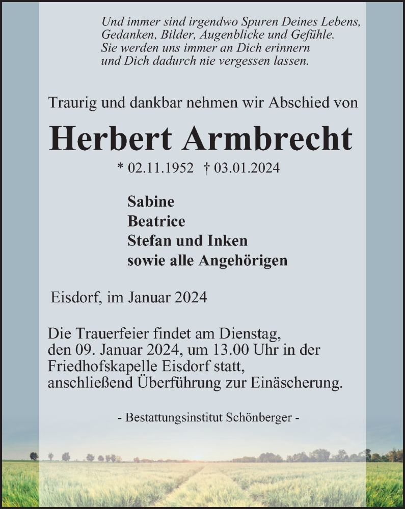 Hier finden Sie alle Traueranzeigen aus der Zeitung, die bisher für Herbert Armbrecht erschienen sind. Weitere Traueranzeigen, die in der Zeitung erscheinen, werden hier ebenfalls aufgelistet