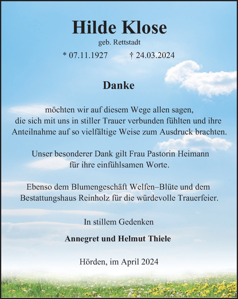Hier finden Sie alle Traueranzeigen aus der Zeitung, die bisher für Hilde Klose erschienen sind. Weitere Traueranzeigen, die in der Zeitung erscheinen, werden hier ebenfalls aufgelistet