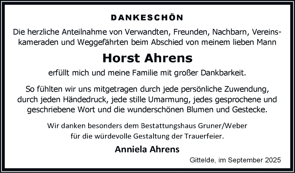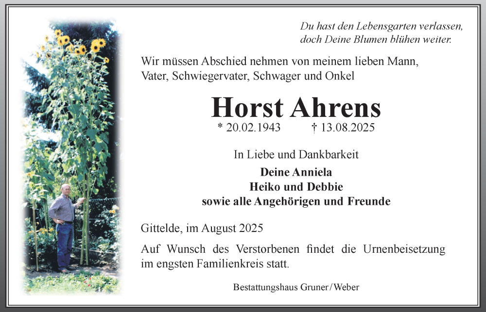 Hier finden Sie alle Traueranzeigen aus der Zeitung, die bisher für Horst Ahrens erschienen sind. Weitere Traueranzeigen, die in der Zeitung erscheinen, werden hier ebenfalls aufgelistet