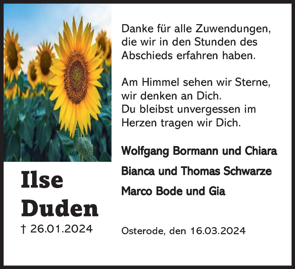 Hier finden Sie alle Traueranzeigen aus der Zeitung, die bisher für Ilse Duden erschienen sind. Weitere Traueranzeigen, die in der Zeitung erscheinen, werden hier ebenfalls aufgelistet
