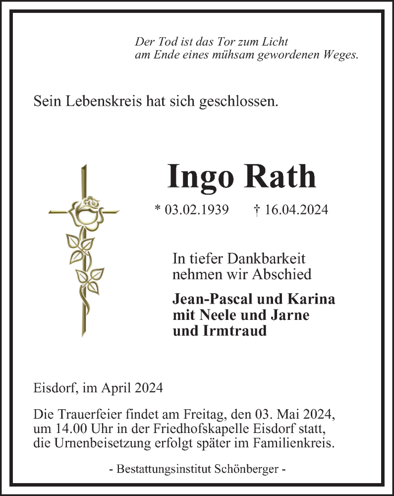 Hier finden Sie alle Traueranzeigen aus der Zeitung, die bisher für Ingo Rath erschienen sind. Weitere Traueranzeigen, die in der Zeitung erscheinen, werden hier ebenfalls aufgelistet