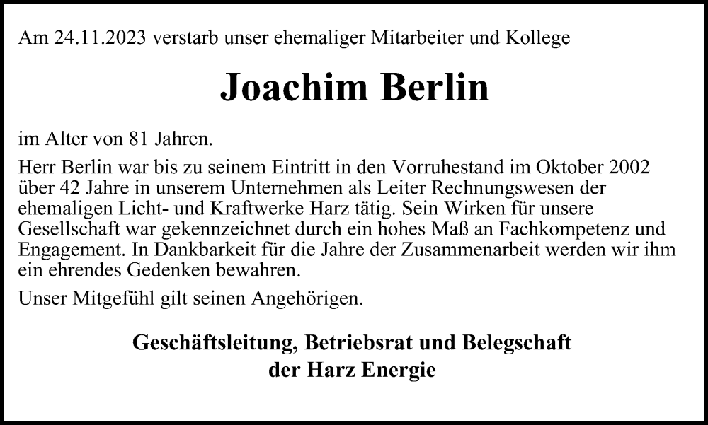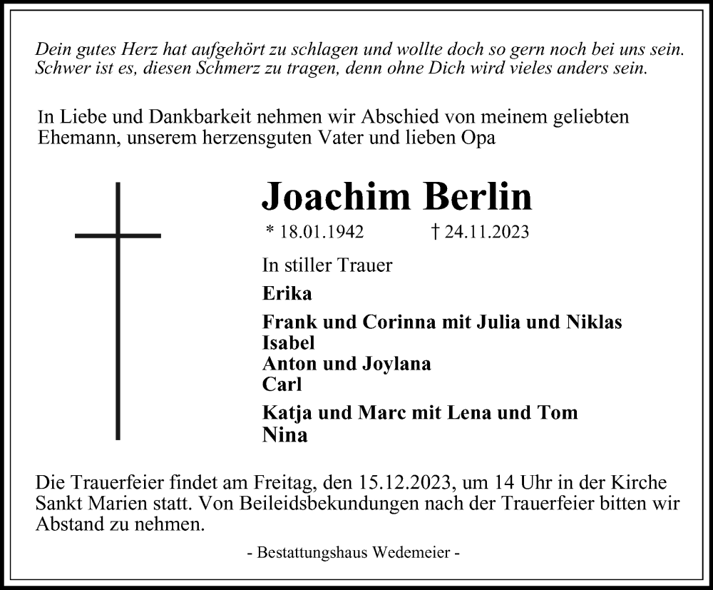 Hier finden Sie alle Traueranzeigen aus der Zeitung, die bisher für Joachim Berlin erschienen sind. Weitere Traueranzeigen, die in der Zeitung erscheinen, werden hier ebenfalls aufgelistet