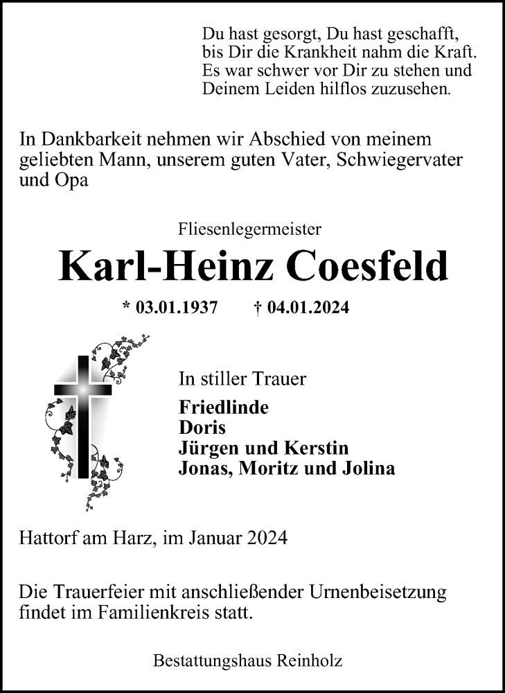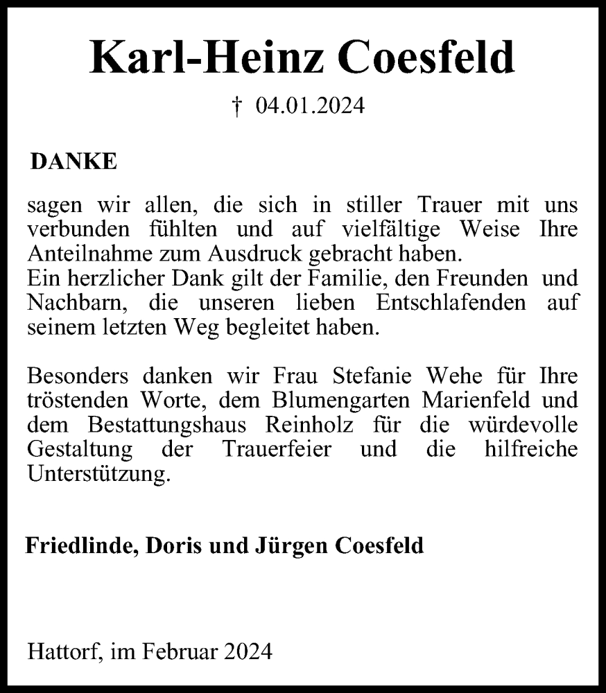 Hier finden Sie alle Traueranzeigen aus der Zeitung, die bisher für Karl-Heinz Coesfeld erschienen sind. Weitere Traueranzeigen, die in der Zeitung erscheinen, werden hier ebenfalls aufgelistet