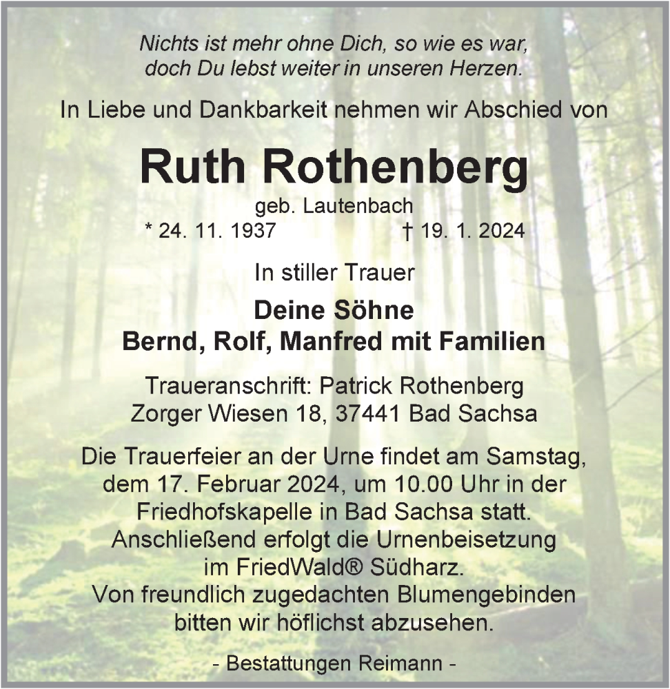Hier finden Sie alle Traueranzeigen aus der Zeitung, die bisher für Ruth Rothenberg erschienen sind. Weitere Traueranzeigen, die in der Zeitung erscheinen, werden hier ebenfalls aufgelistet