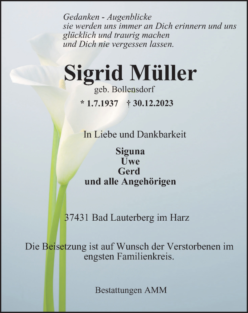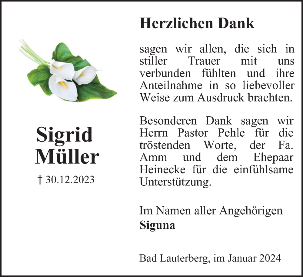Hier finden Sie alle Traueranzeigen aus der Zeitung, die bisher für Sigrid Müller erschienen sind. Weitere Traueranzeigen, die in der Zeitung erscheinen, werden hier ebenfalls aufgelistet