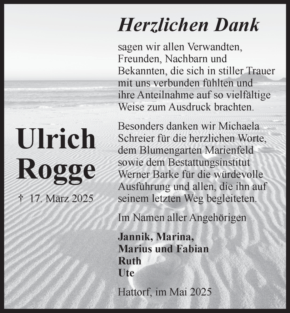Hier finden Sie alle Traueranzeigen aus der Zeitung, die bisher für Ulrich Rogge erschienen sind. Weitere Traueranzeigen, die in der Zeitung erscheinen, werden hier ebenfalls aufgelistet