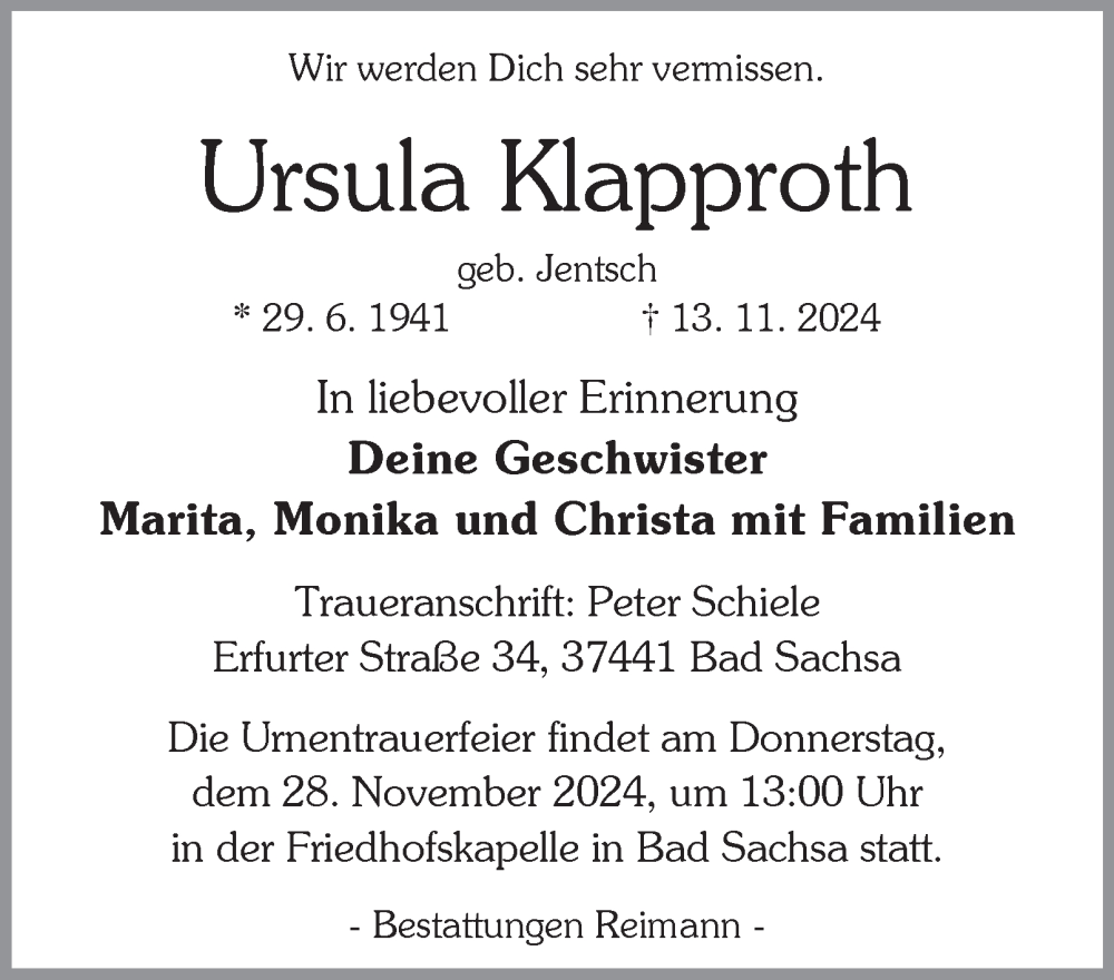 Hier finden Sie alle Traueranzeigen aus der Zeitung, die bisher für Ursula Klapproth erschienen sind. Weitere Traueranzeigen, die in der Zeitung erscheinen, werden hier ebenfalls aufgelistet